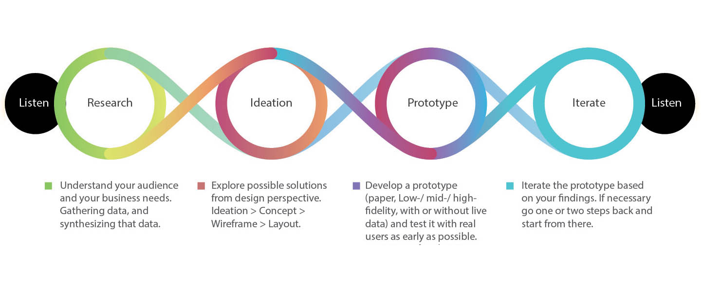 There is no secret to our process. We leverage standard design processes that have been in place since the invention of the wheel. Starting with the need we listen carefully and focus on the real need. We research before we launch into our creative stage. Once we have developed some ideas we present allowing a feedback session. Building on the information gathered we finalize the prototype and delivered the product the analytical phase begins. KPI’s are established and data is gathered. We schedule a review period and wrap with a final meeting.